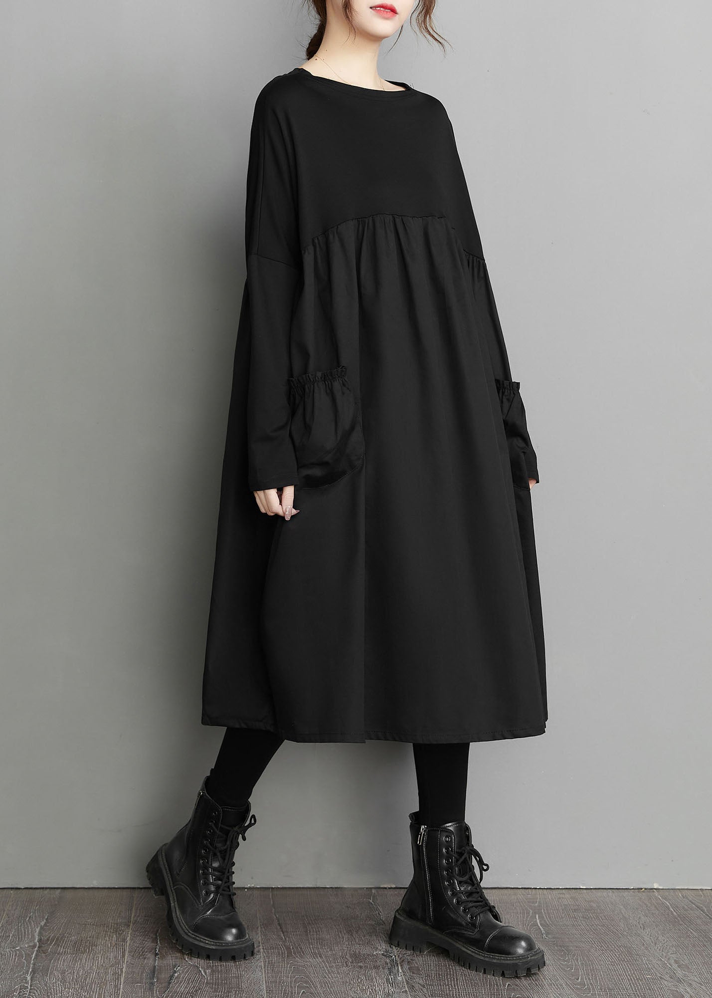 Oversized Black O Neck Wrinkled Pockets Patchwork Cotton Dress Spring