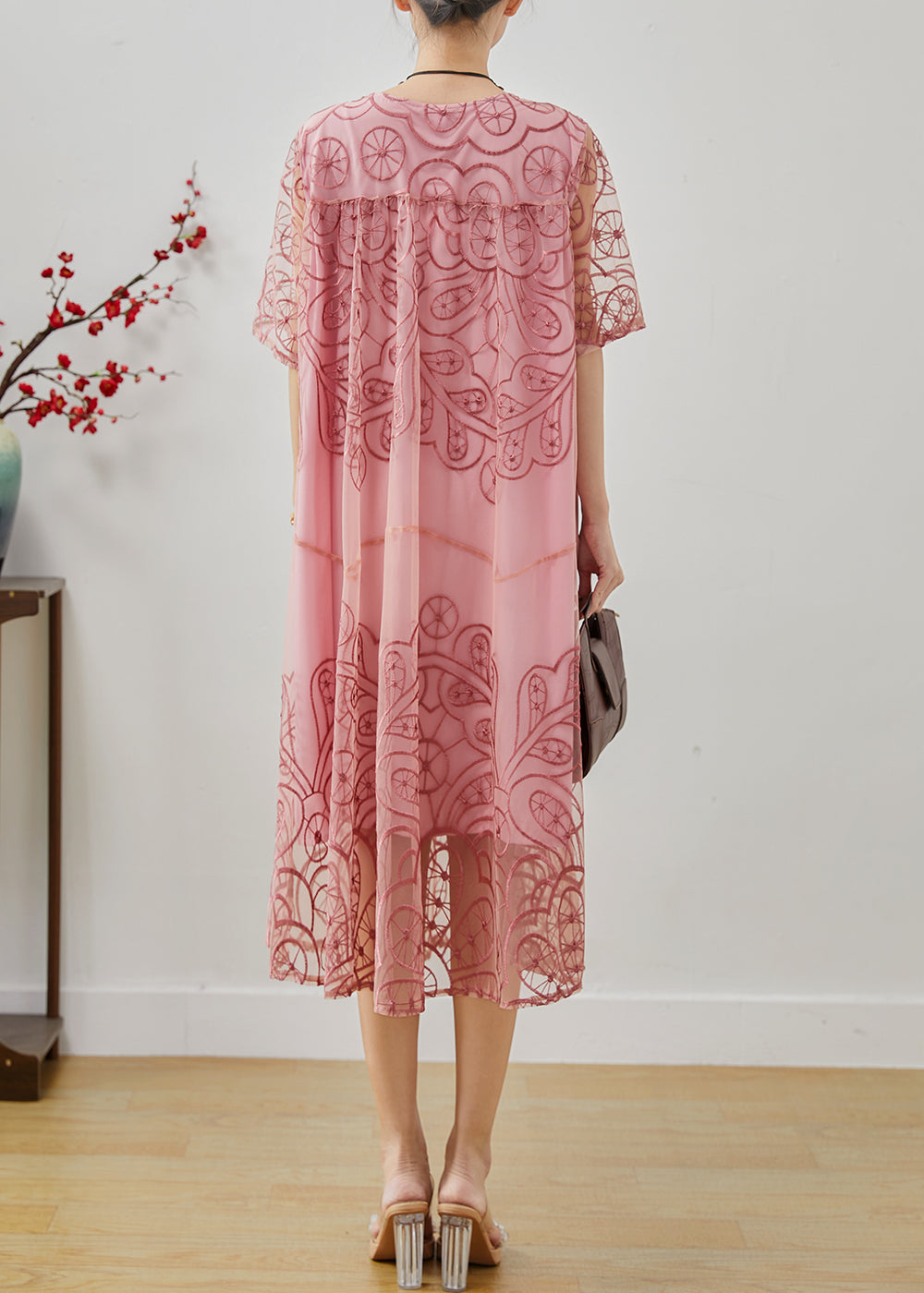 Beautiful Pink Embroidered Tulle Ankle Dress Summer