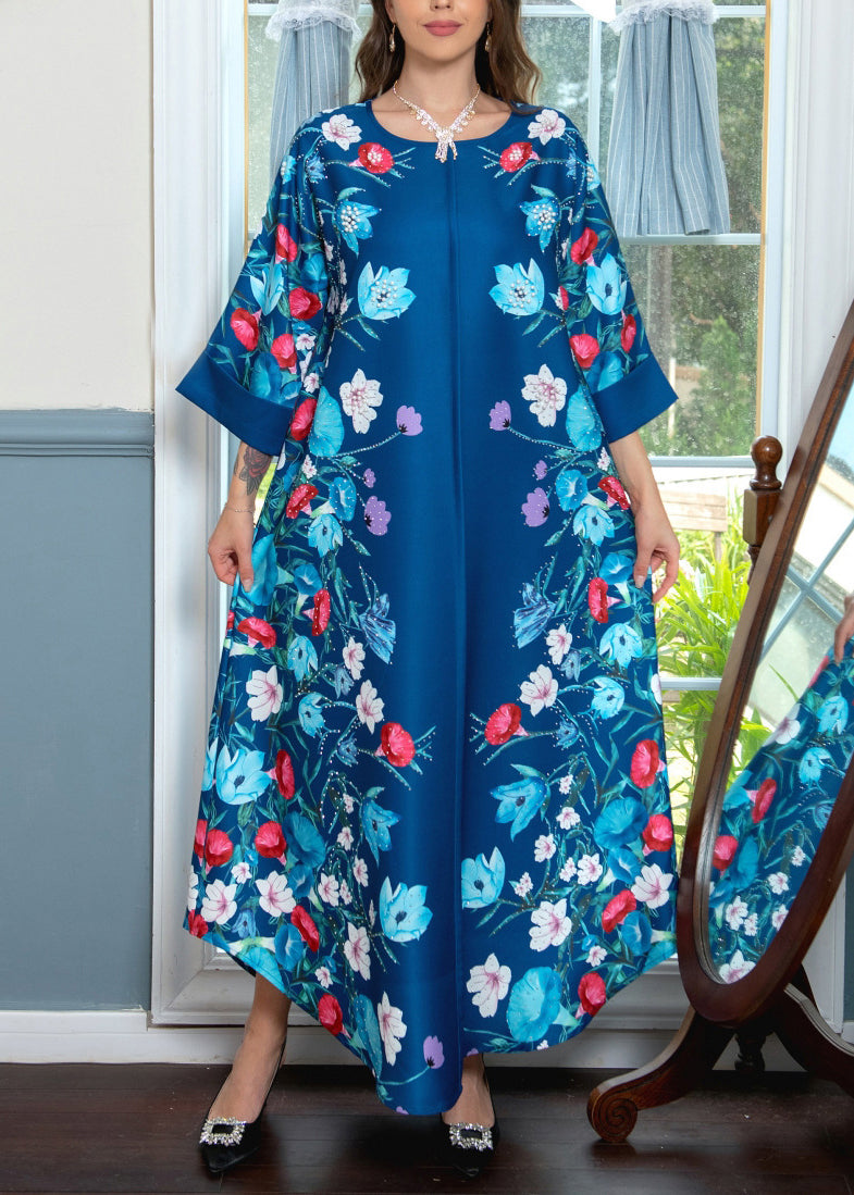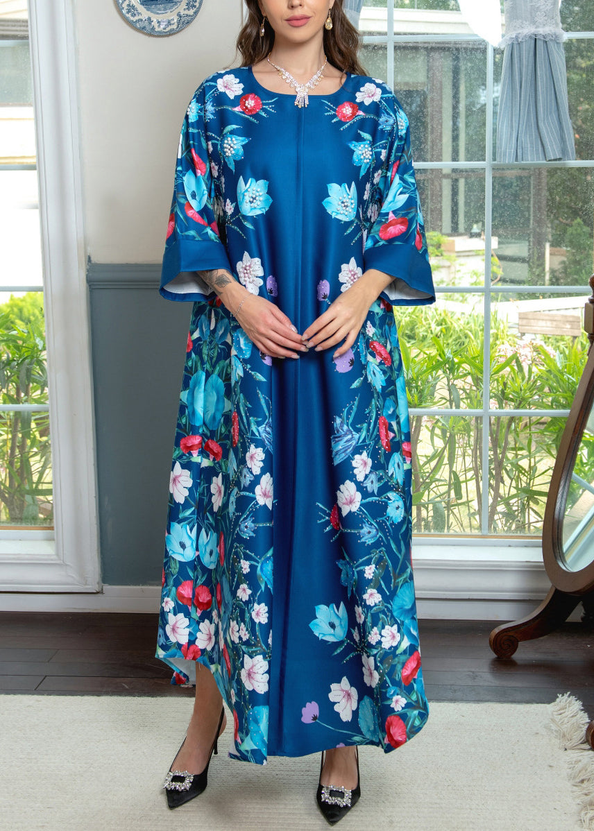 Blue Print Nail Bead Cotton Maxi Dresses O Neck Bracelet Sleeve