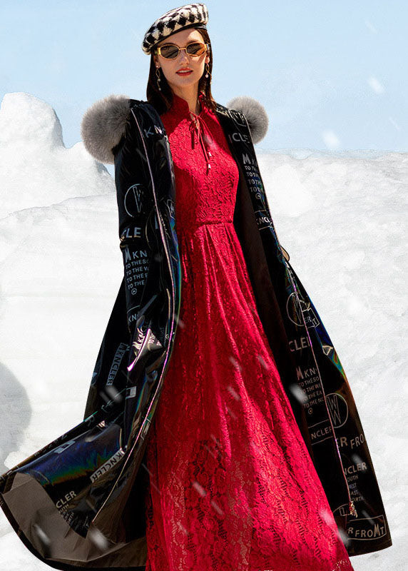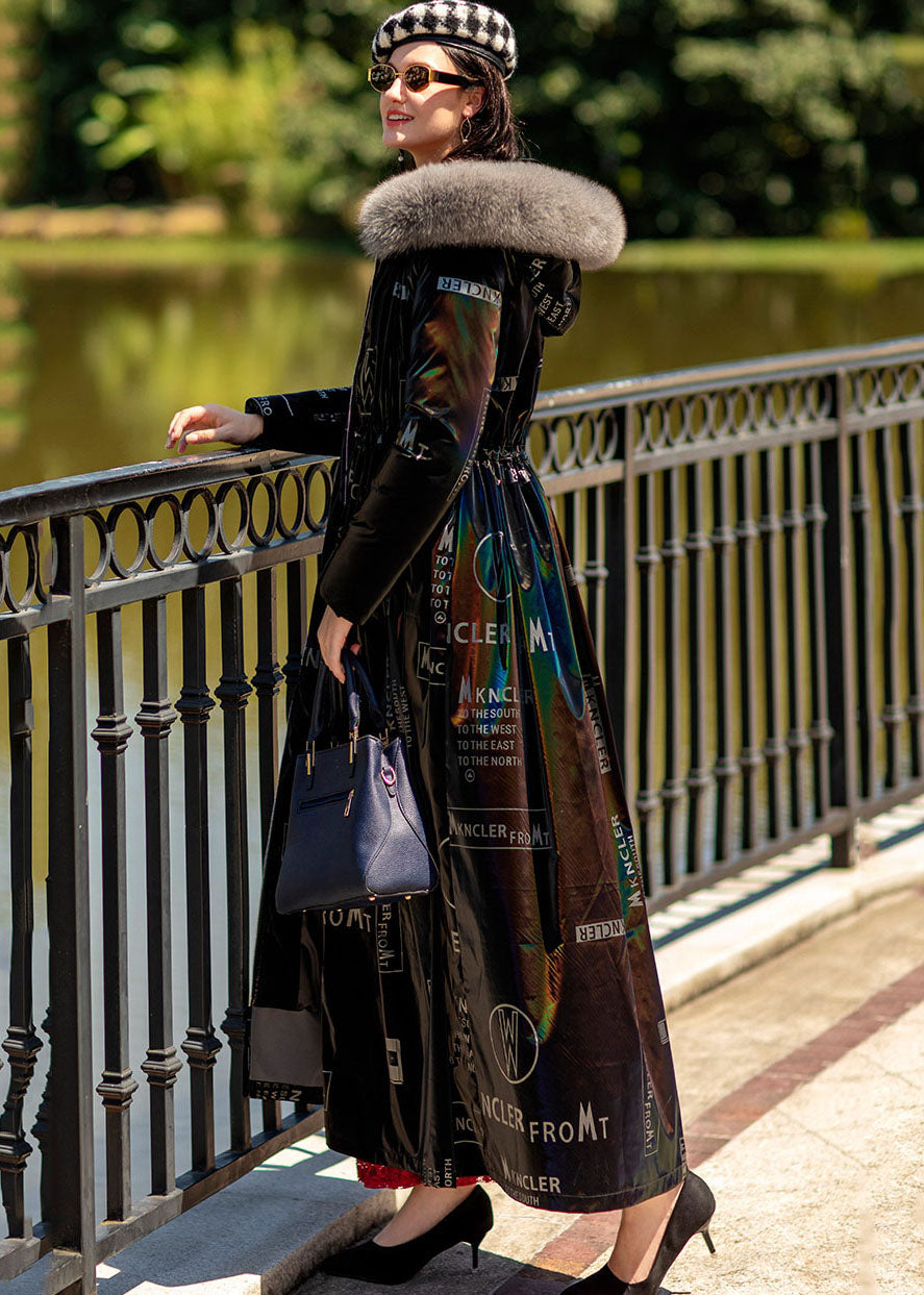Boho Black Fox collar Drawstring Letter Print Duck Down Puffers Jackets Winter