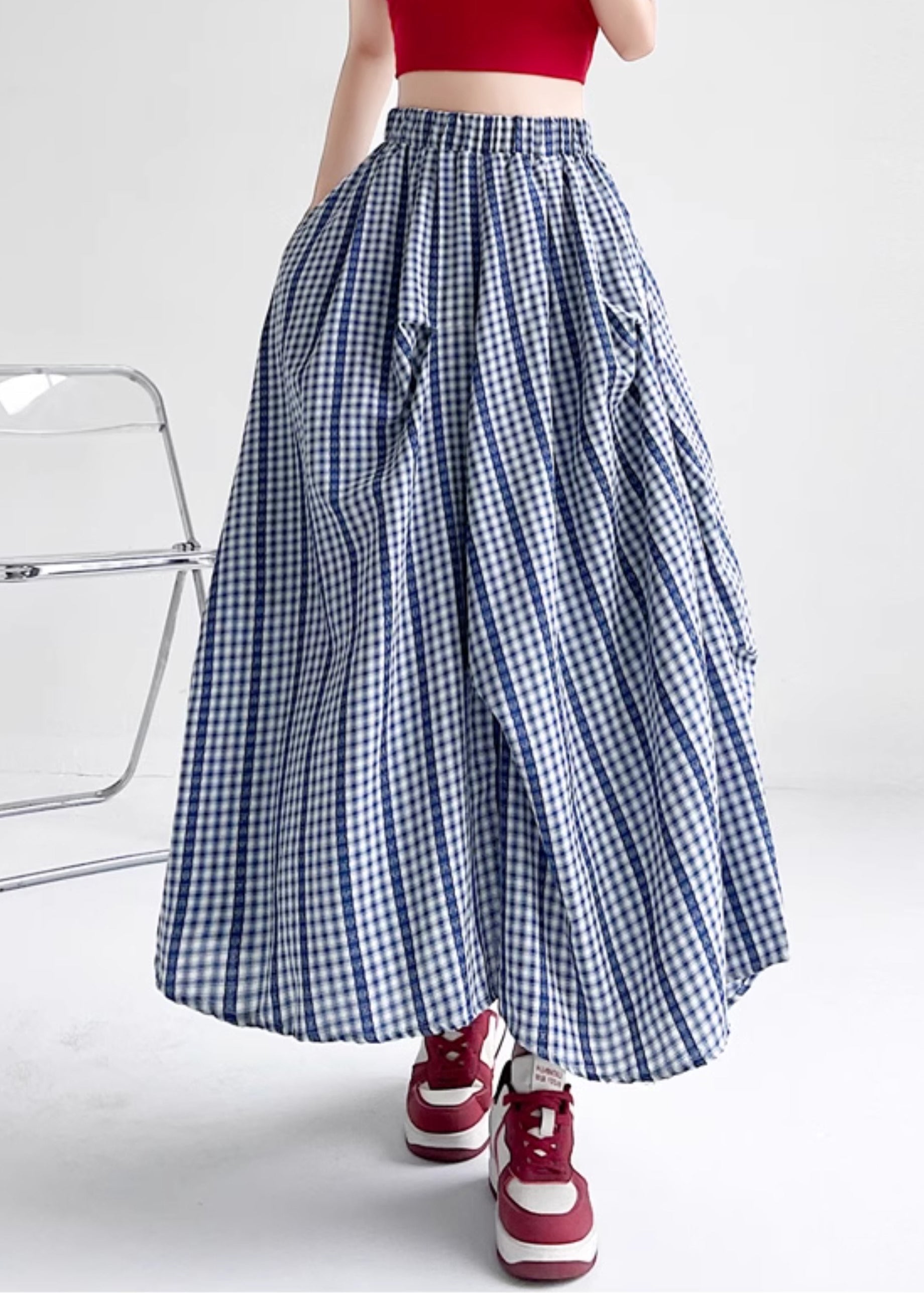 Boutique Blue Plaid Pockets Patchwork A Line Skirts Summer