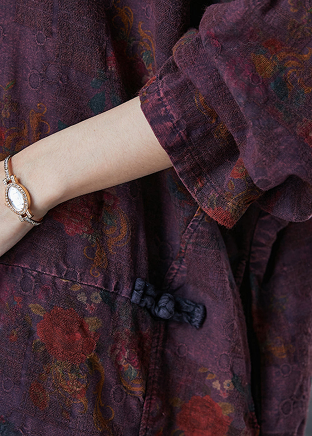 Boutique Dull Purple Print Chinese Button Linen Dress Spring
