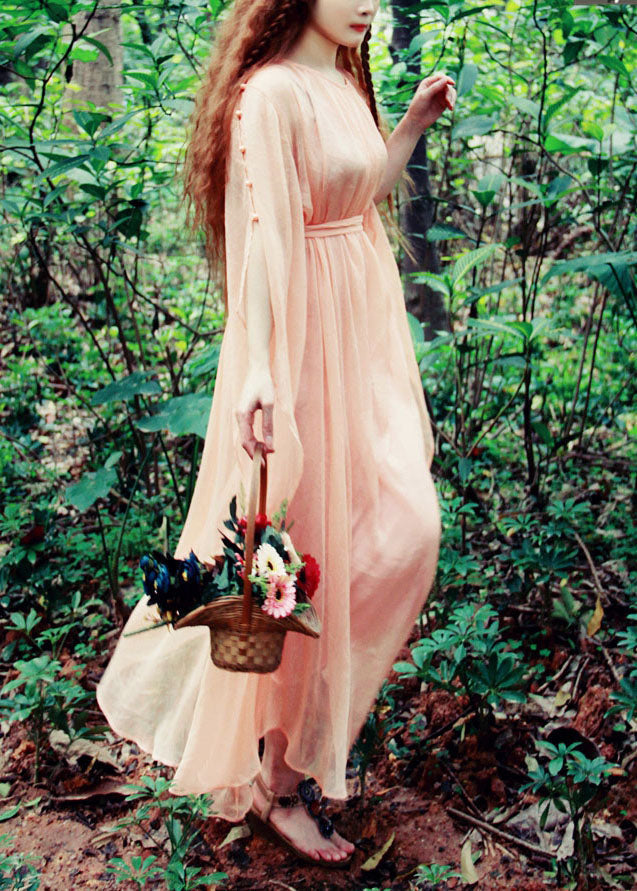 Boutique Orange Pink O-Neck Tie Waist Exra Large Hem Silk Robe Dresses Batwing Sleeve