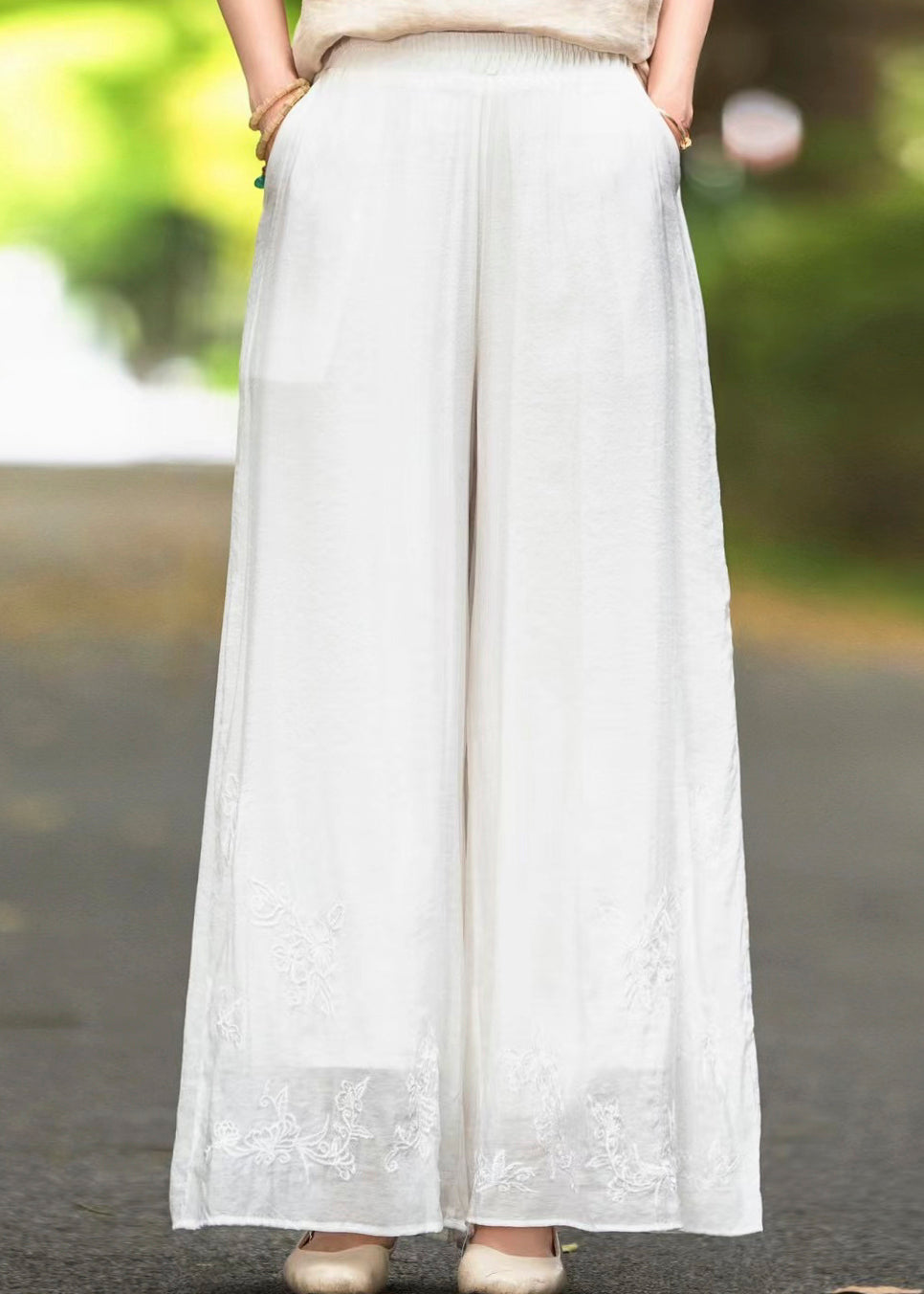 Boutique Pink Embroidered Pockets Elastic Waist Silk Pants Fall