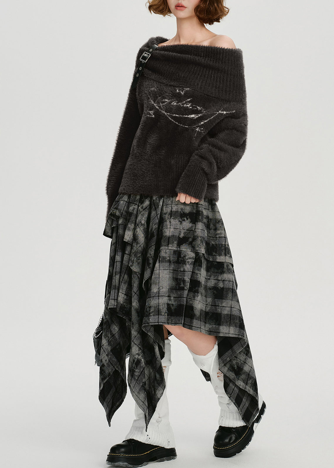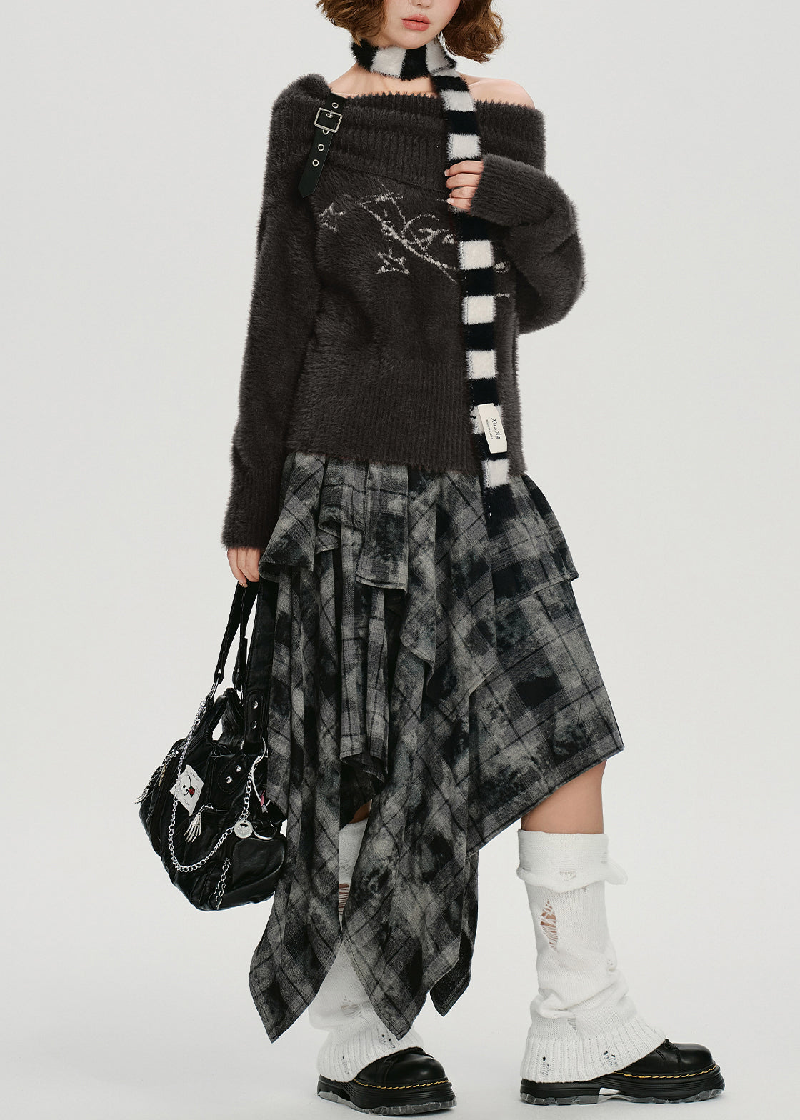 Casual Chocolate Cold Shoulder Print Faux Mink Knit Pullover Winter