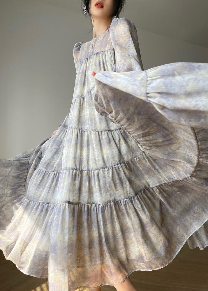 Chic O-Neck Print Button Wrinkled Chiffon Maxi Dresses Long Sleeve