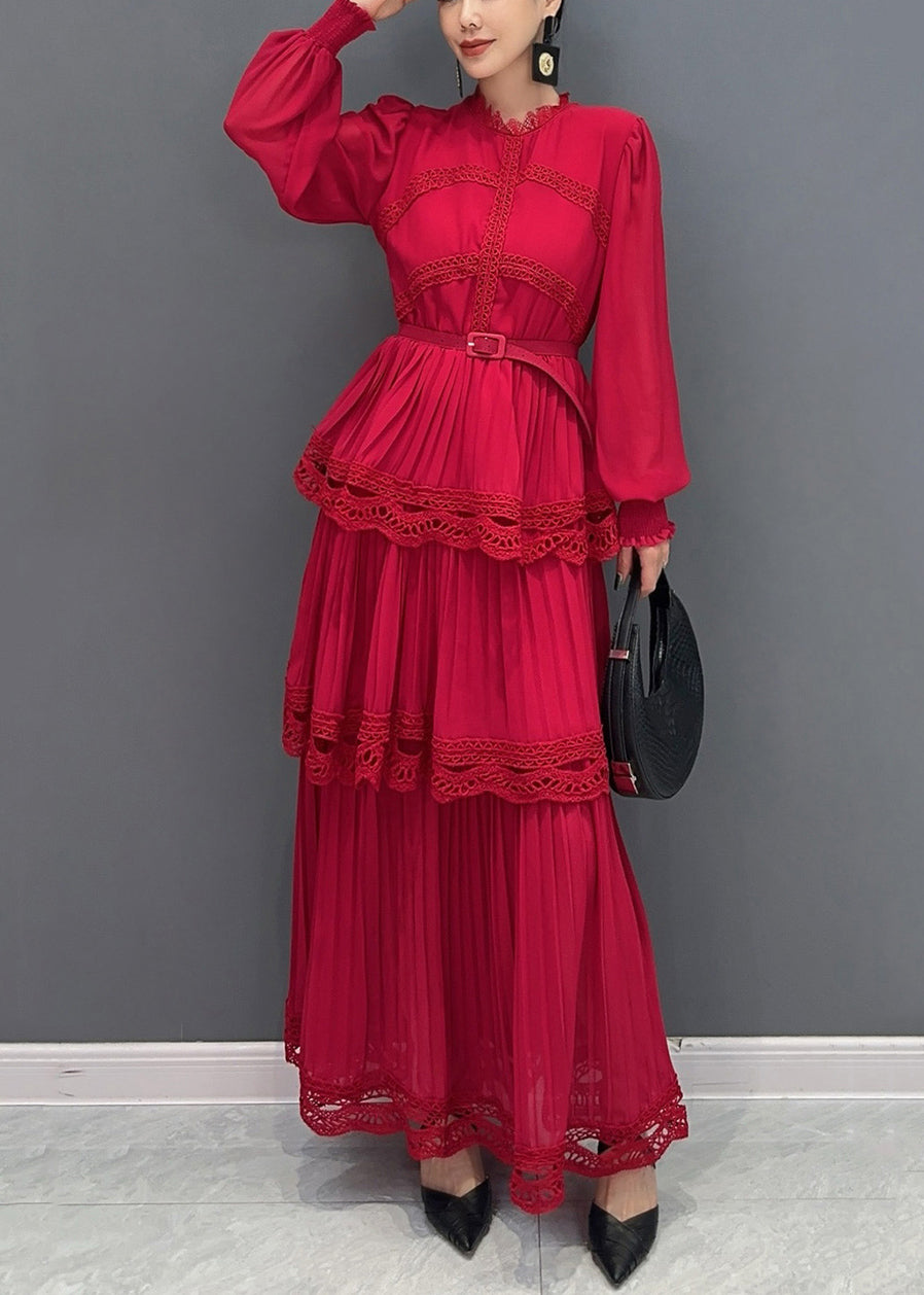 Classy Red Sashes Patchwork Chiffon Dress Long Sleeve