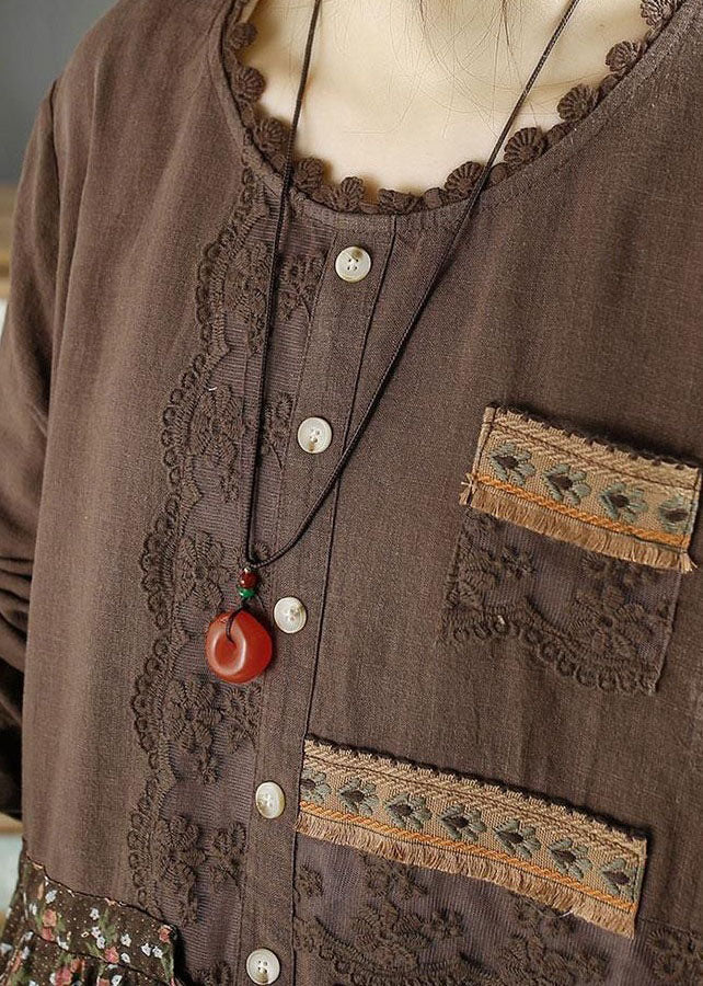 Coffee Print Patchwork Cotton Long Dress Drawstring O Neck Lace Spring