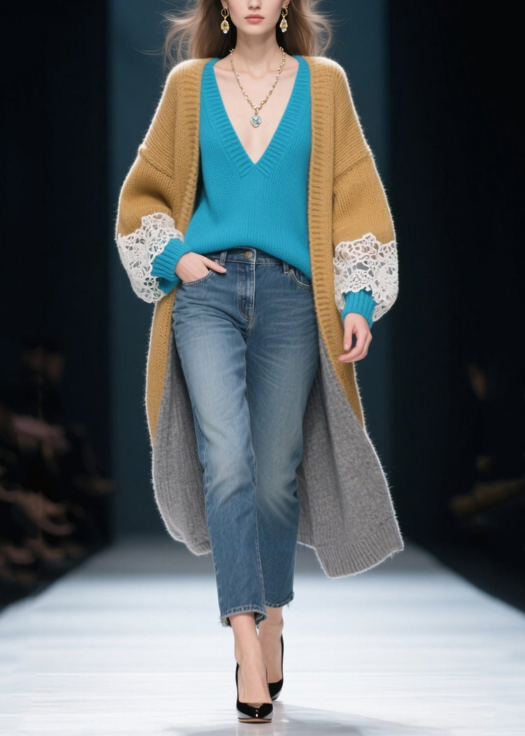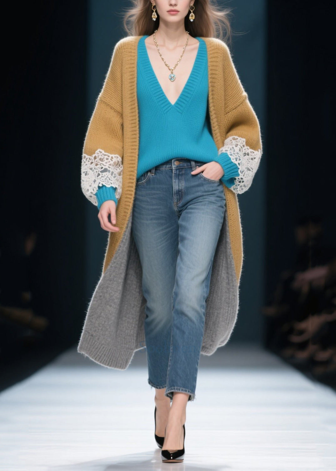 DIY Khaki Oversized Patchwork Lace Cardigan Winter