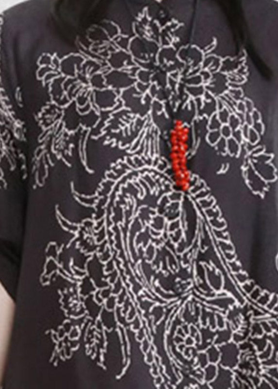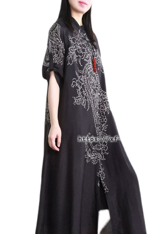 Elegant Black Stand Collar Button Print Pockets Linen Cardigans Half Sleeve