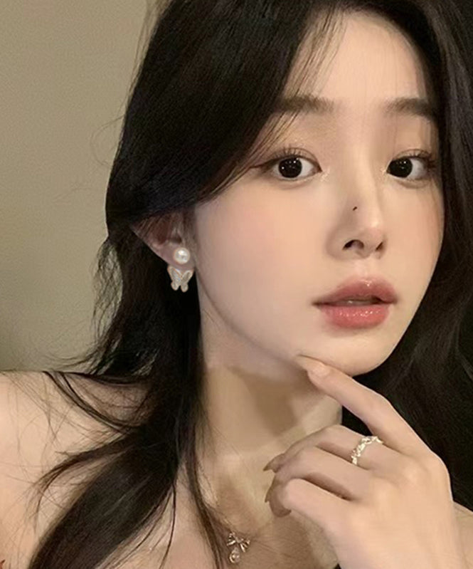 Elegant White Copper Butterfly Pearl Stud Earrings