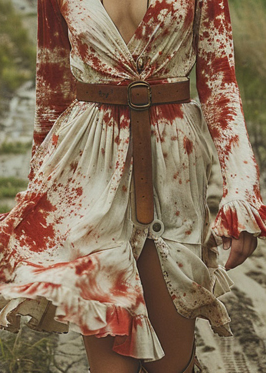 Fitted V Neck Ruffled Tie Dye Cotton Dresses Flare Sleeve