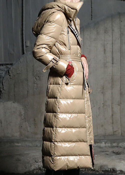 French Black Hooded Zippered Tie Waist Duck Down Down Coat Long Sleeve