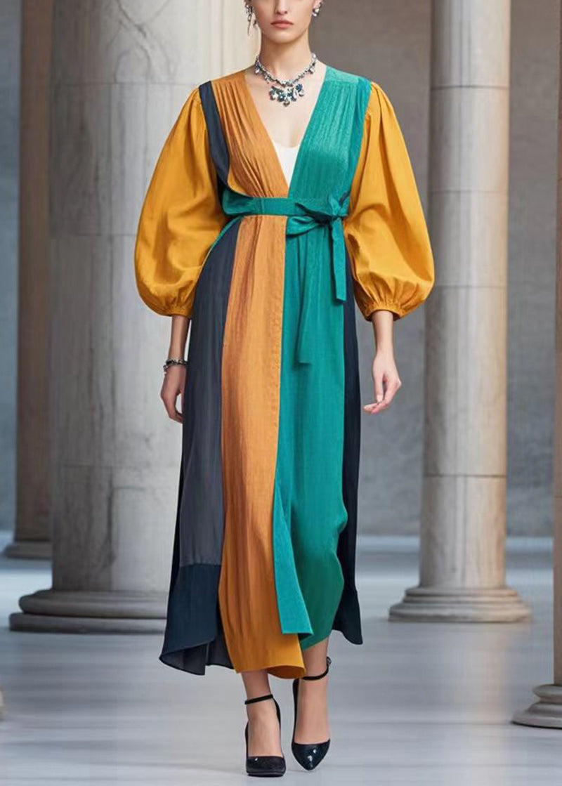 French Colorblock Cinched Patchwork Cotton Ankle Dress Bracelet Sleeve