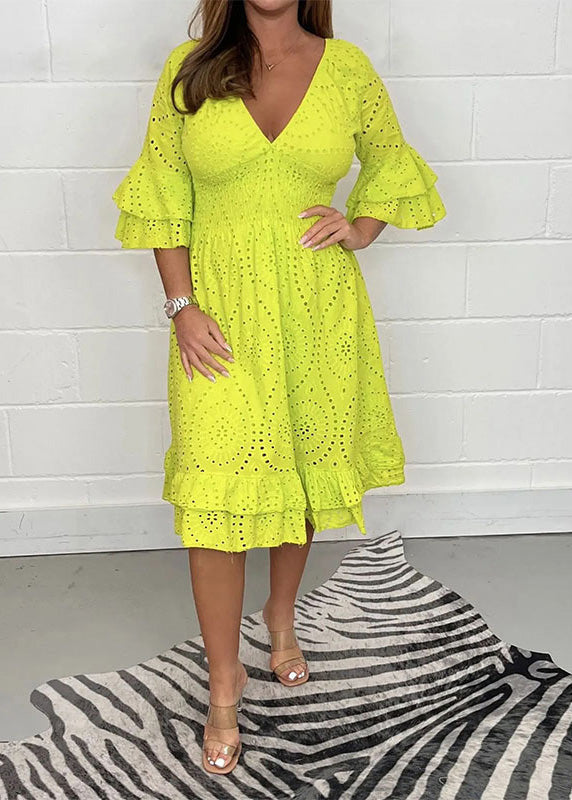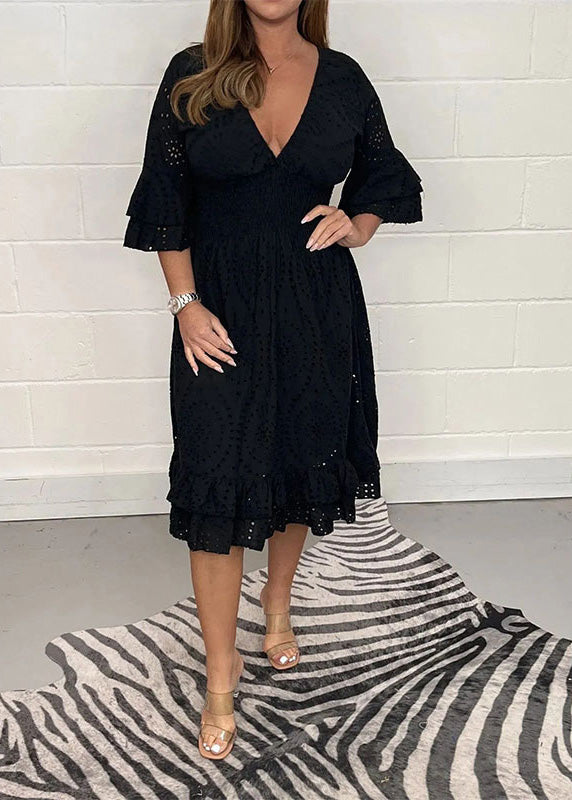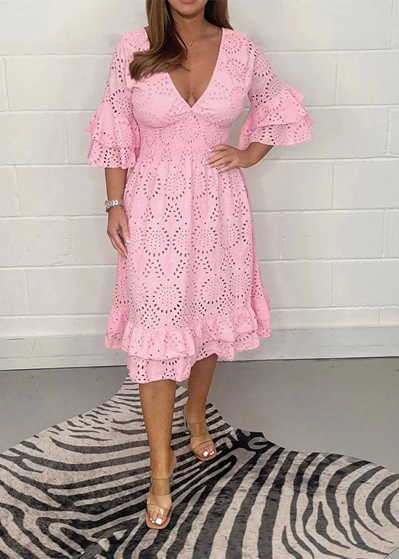 Handmade Red V Neck Hollow Out Lace Mid Dress Flare Sleeve
