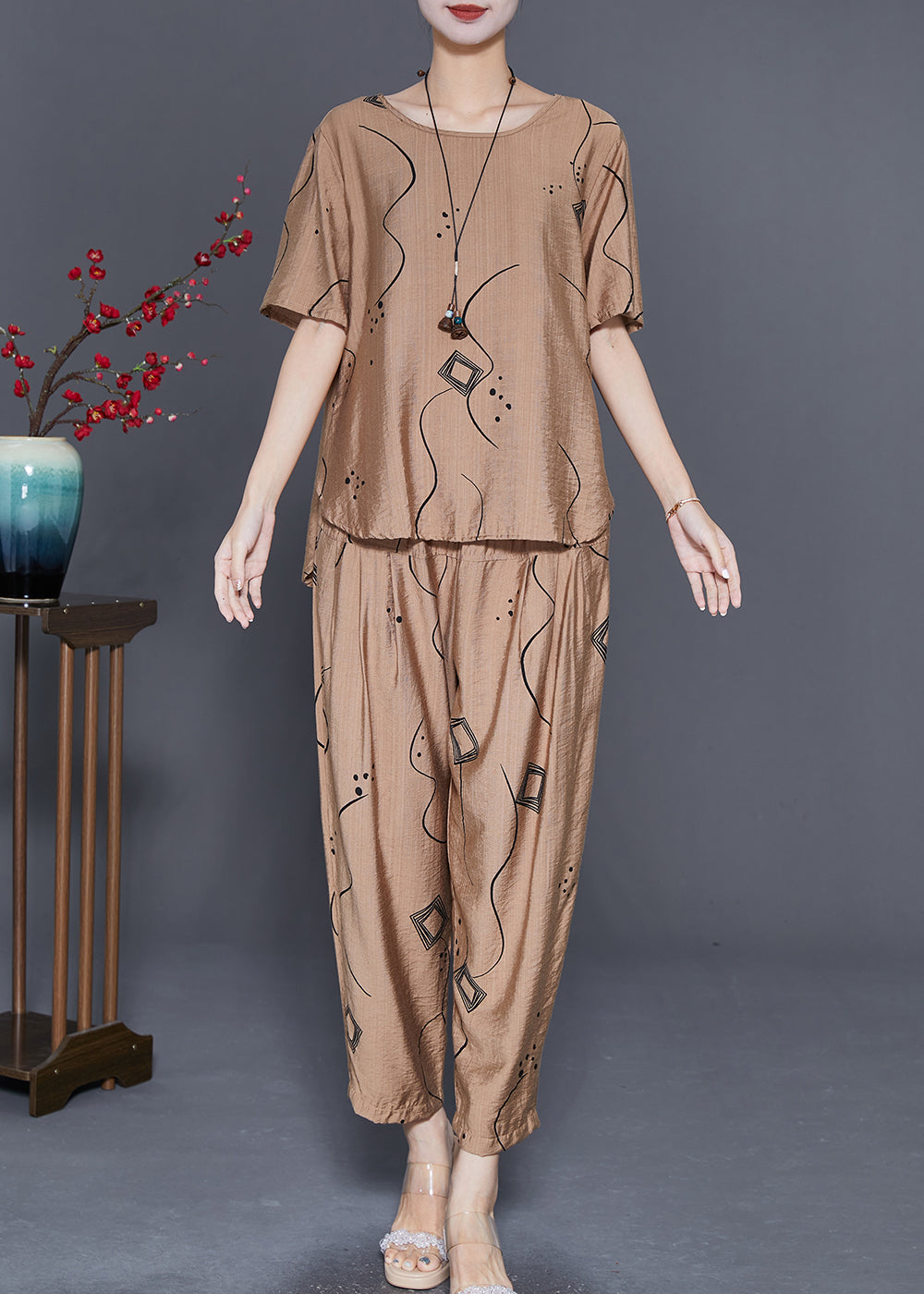 Khaki Print Linen Two Pieces Set Low High Design Summer