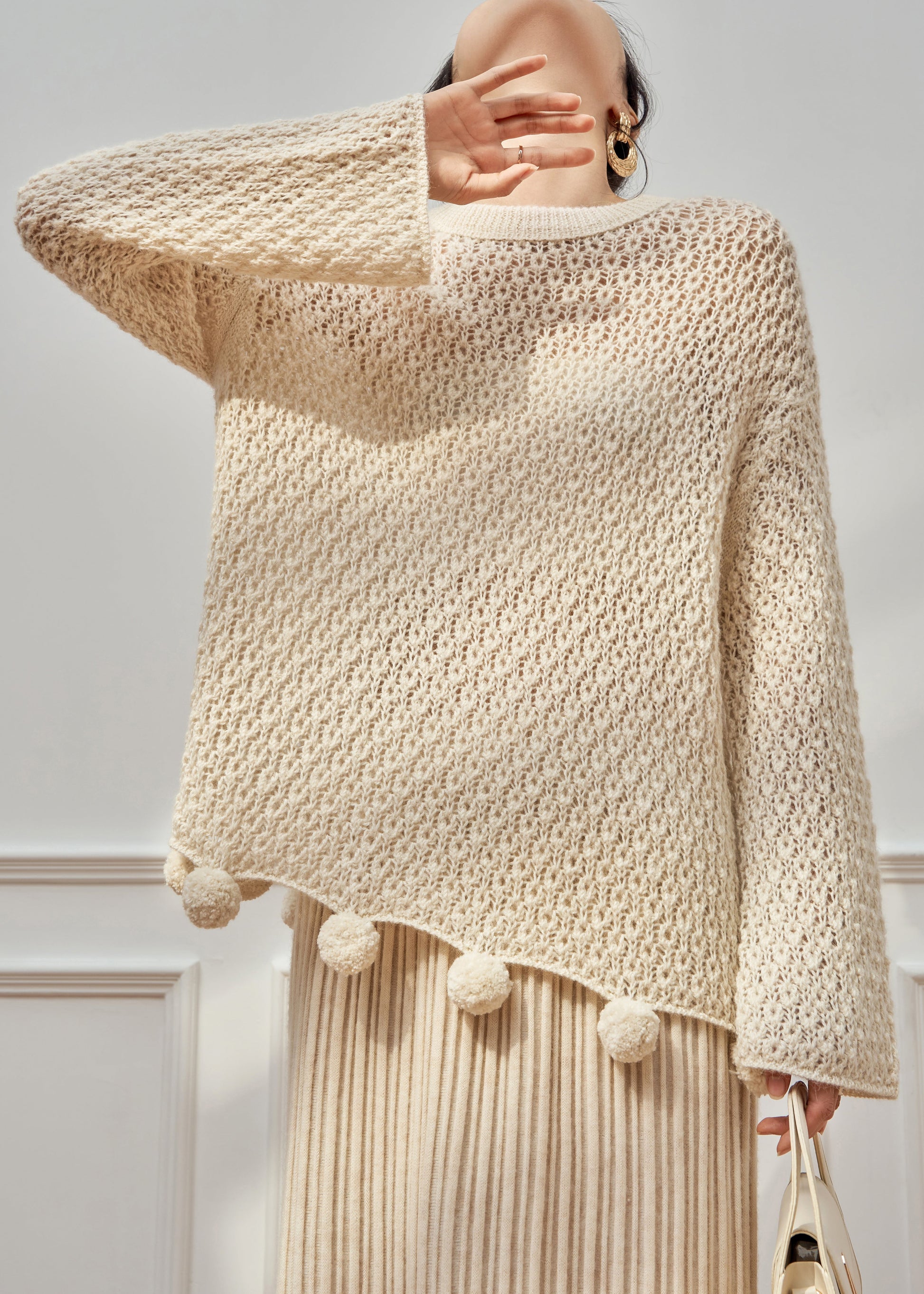 Loose Beige O Neck Hollow Out Fuzzy Ball Decorated Knit Two Pieces Set Fall