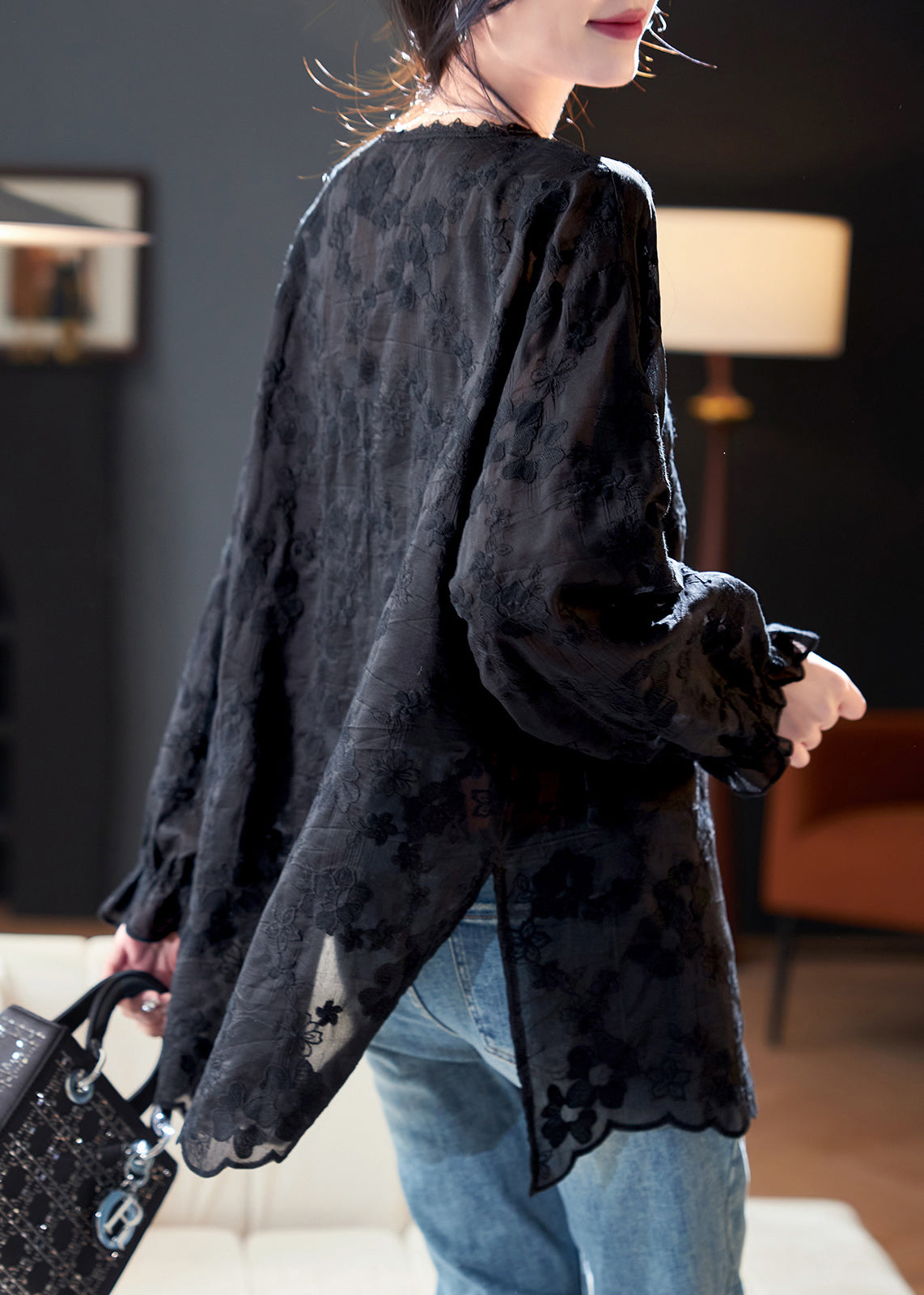 Loose Black Embroidered Nail Bead Silk Cotton Top Spring