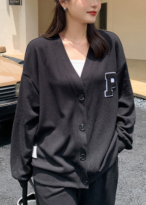 Loose Black V Neck Button Patchwork Cotton Cardigan Fall