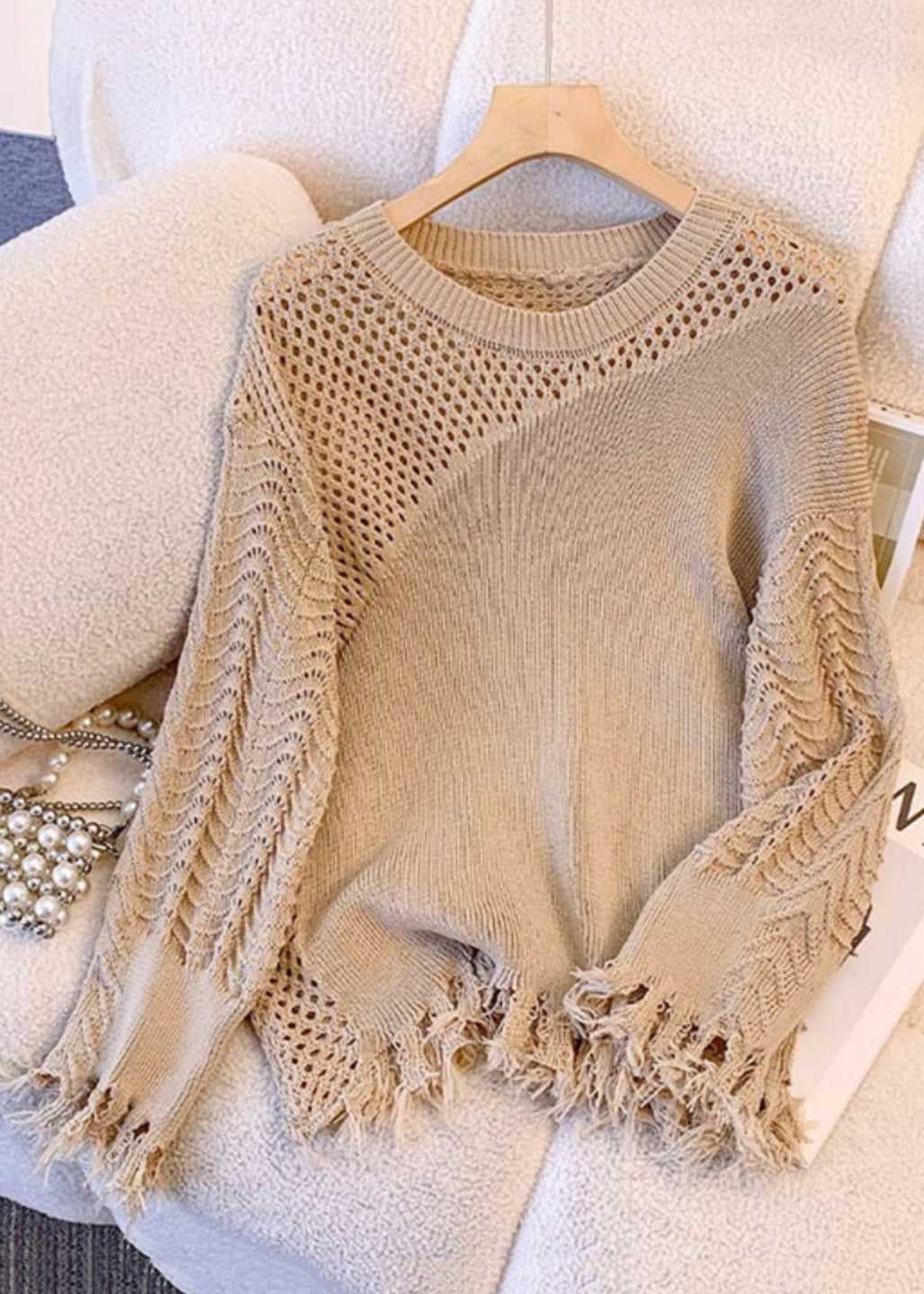 Loose Khaki Tasseled Hollow Out Knit Sweater Fall