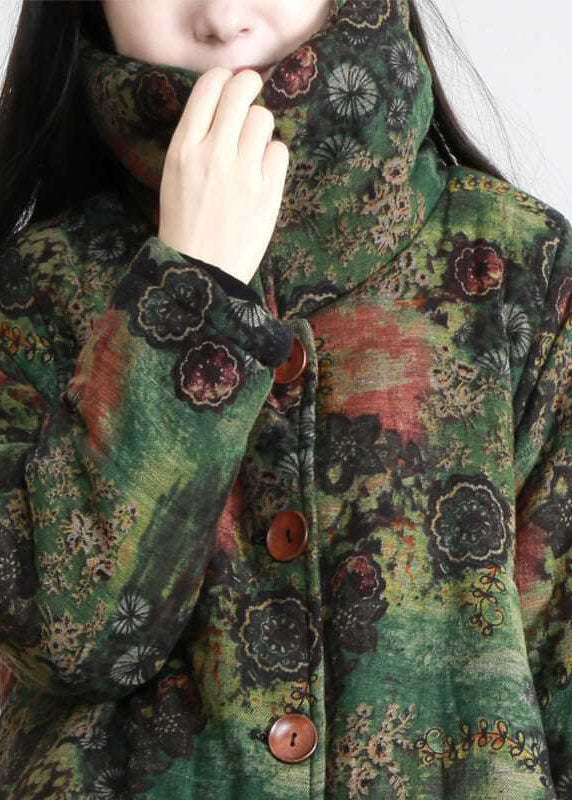 Modern Green High Neck Print Lengthen Fine Cotton Filled Coats Winter