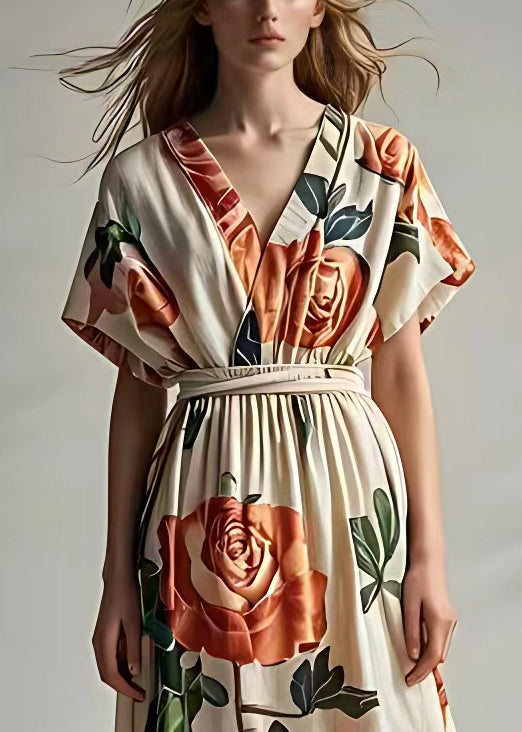 New Beige Print High Waist Cotton Maxi Dress Summer