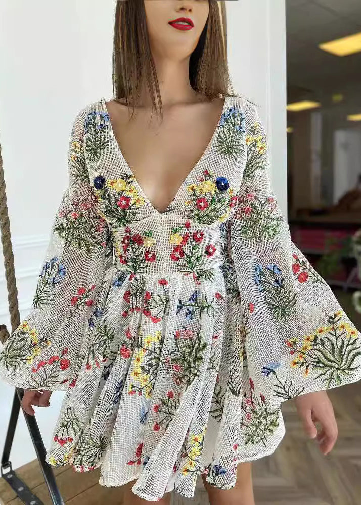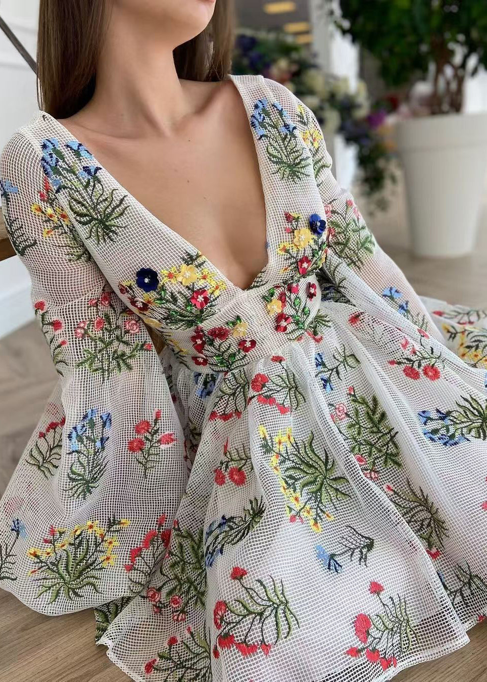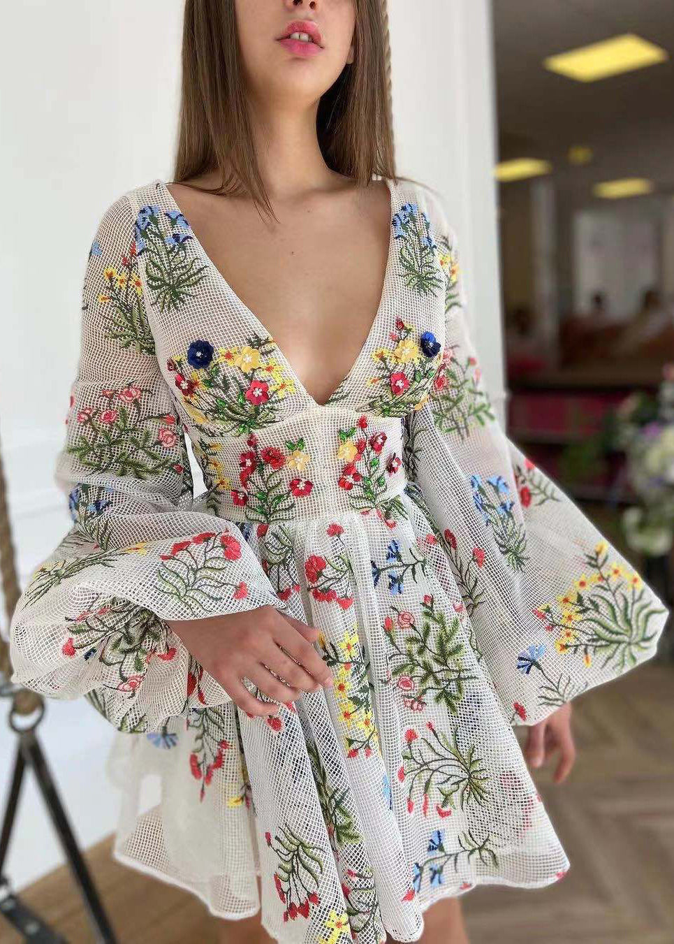New Beige V Neck Embroidered Tulle Mid Dress Lantern Sleeve