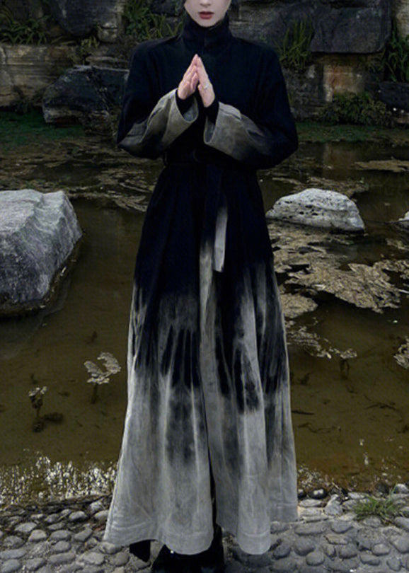 New Chinese Style Tie Dye Stand Collar Tie Waist Denim Dress Autumn