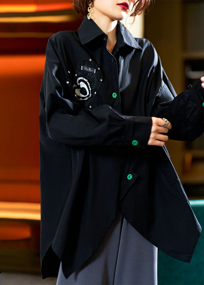 Plus Size Black Peter Pan Collar Zircon Patchwork Cotton Shirts Top Fall