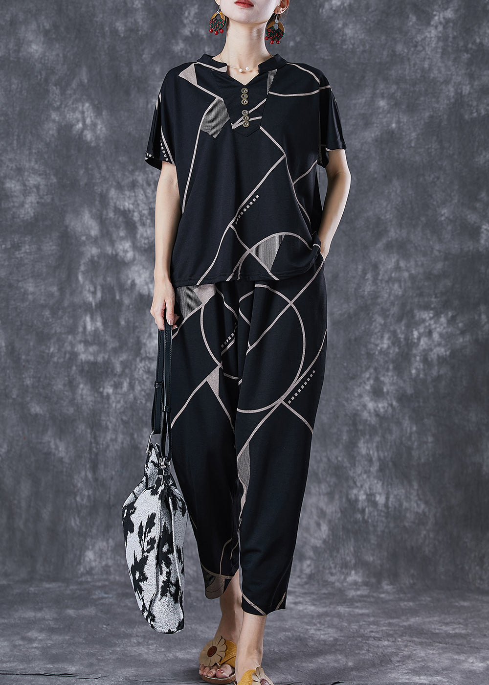 Plus Size Black V Neck Print Button Cotton Two Pieces Set Summer