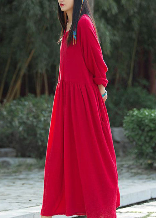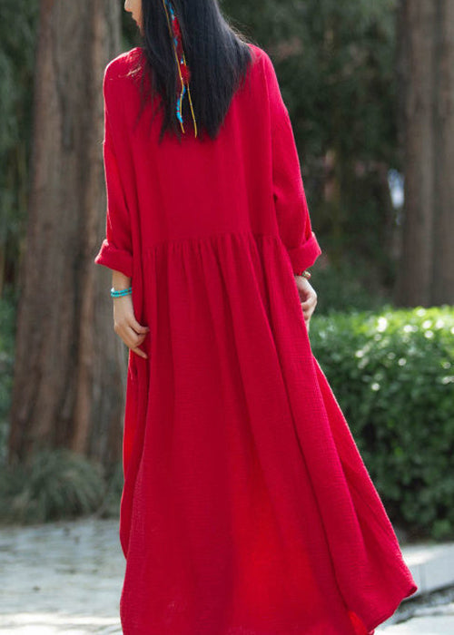 Red Wrinkled Patchwork Linen Dress V Neck Long Sleeve