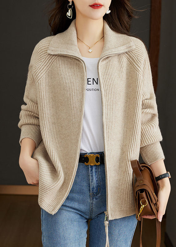 Simple Apricot Peter Pan Collar Zippered Patchwork Wool Coat Fall