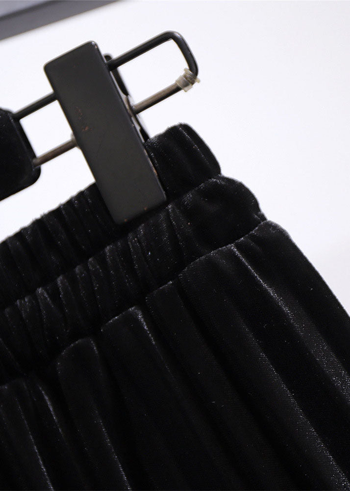Simple Coffee Elastic Waist Patchwork Velour Pleated Skirt Fall