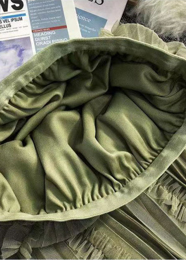 Simple Green Elastic Waist Ruffled Tulle Pleated Skirts Spring