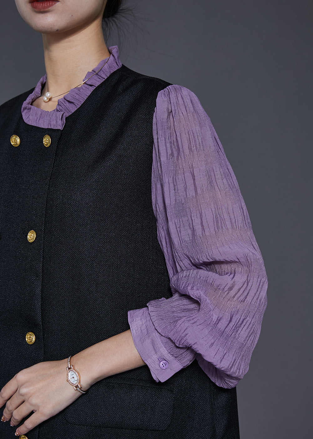 Style Black Double Breast Patchwork Cotton Fake Two Piece Dress Spring