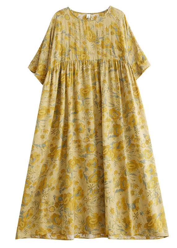 Stylish Yellow O-Neck Print Chiffon Vacation Long Dress Short Sleeve