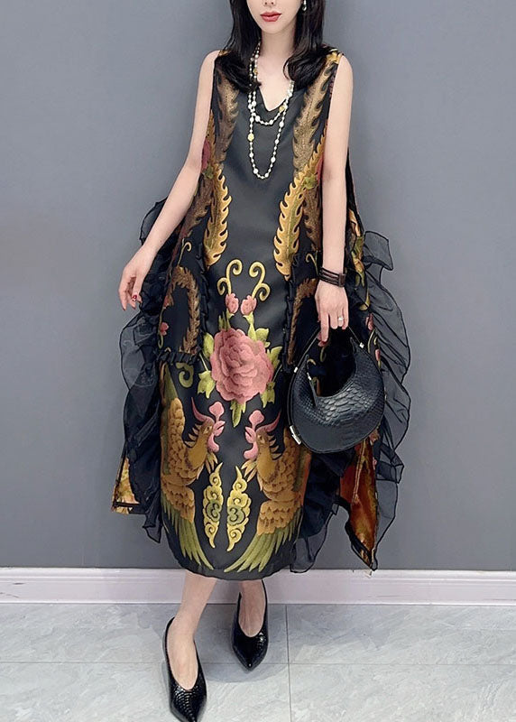 Vintage Black V Neck Print Ruffled Patchwork Silk Dress Sleeveless