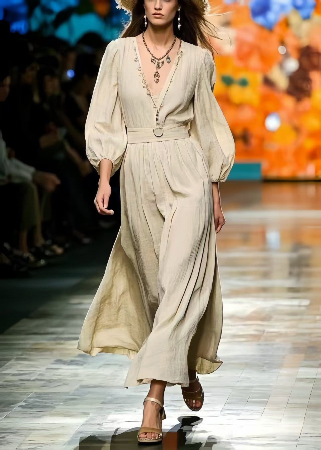 Vintage Exra Large Hem Linen Maxi Dress Bracelet Sleeve