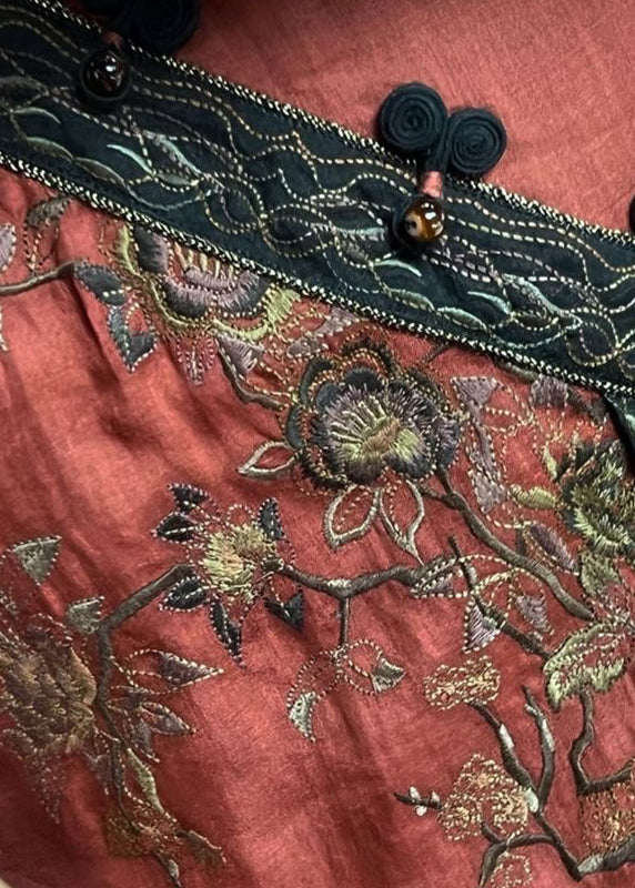 Vintage Red V Neck Embroidered Side Open Linen Dress Summer