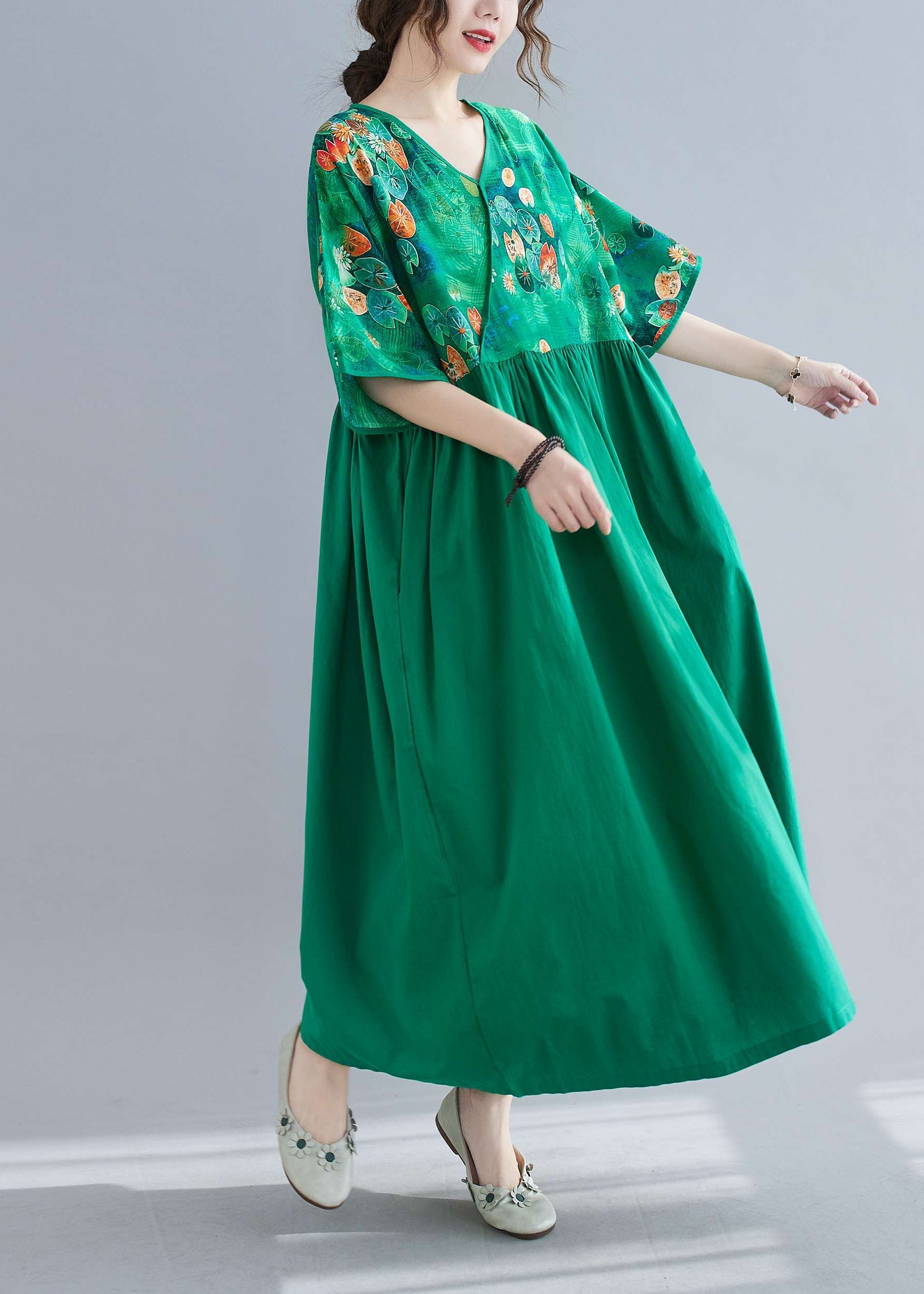 Women Green Cinched Print Long Dress Half Sleeve