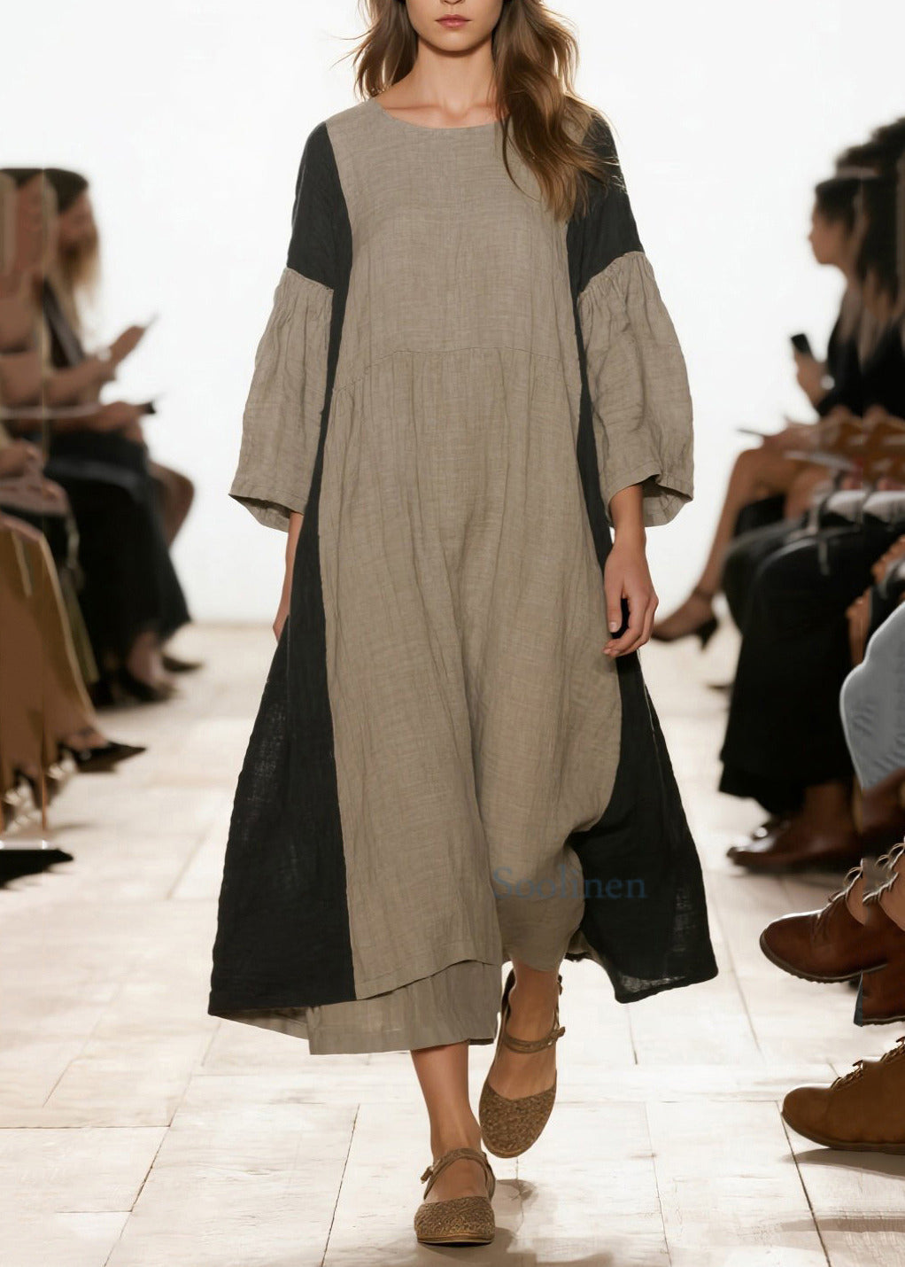 Women Grey Oversized Patchwork Linen Vacation Dresses Bracelet Sleeve