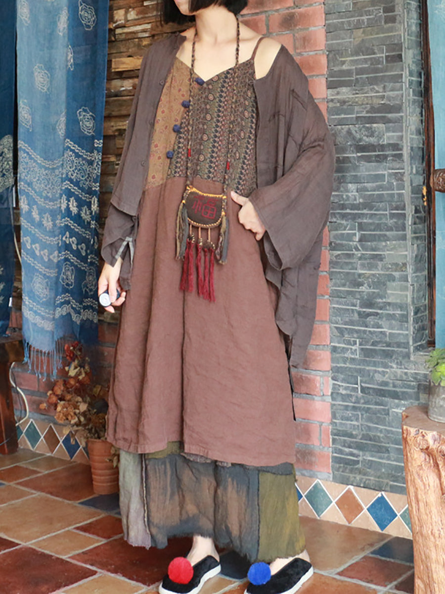 Women Retro Ethnic Spliced Frog V-Neck Slip Dress