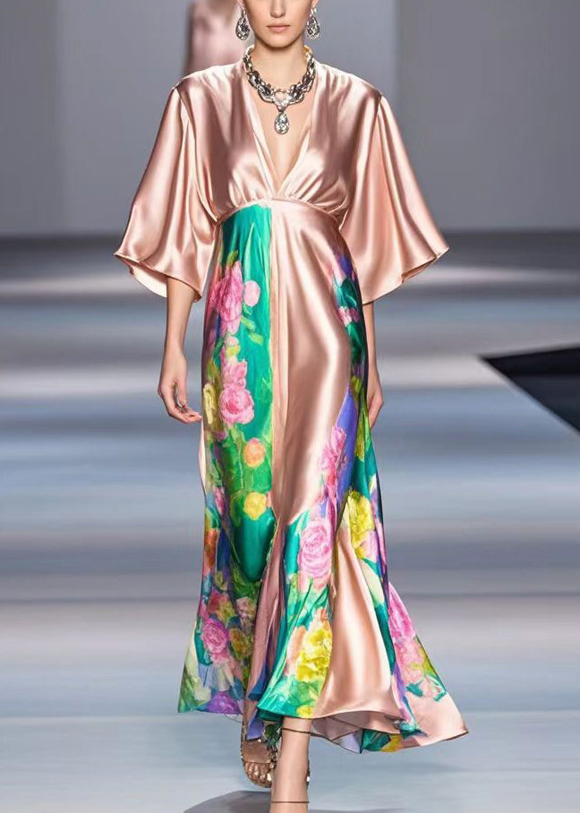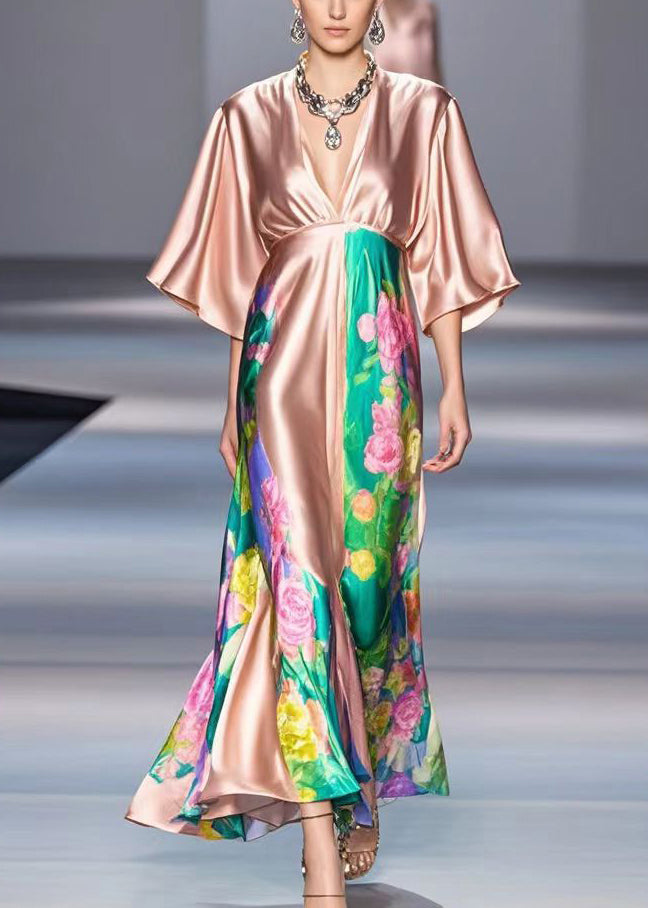 Women Rubber Red V Neck Print Draping Silk Dress Summer