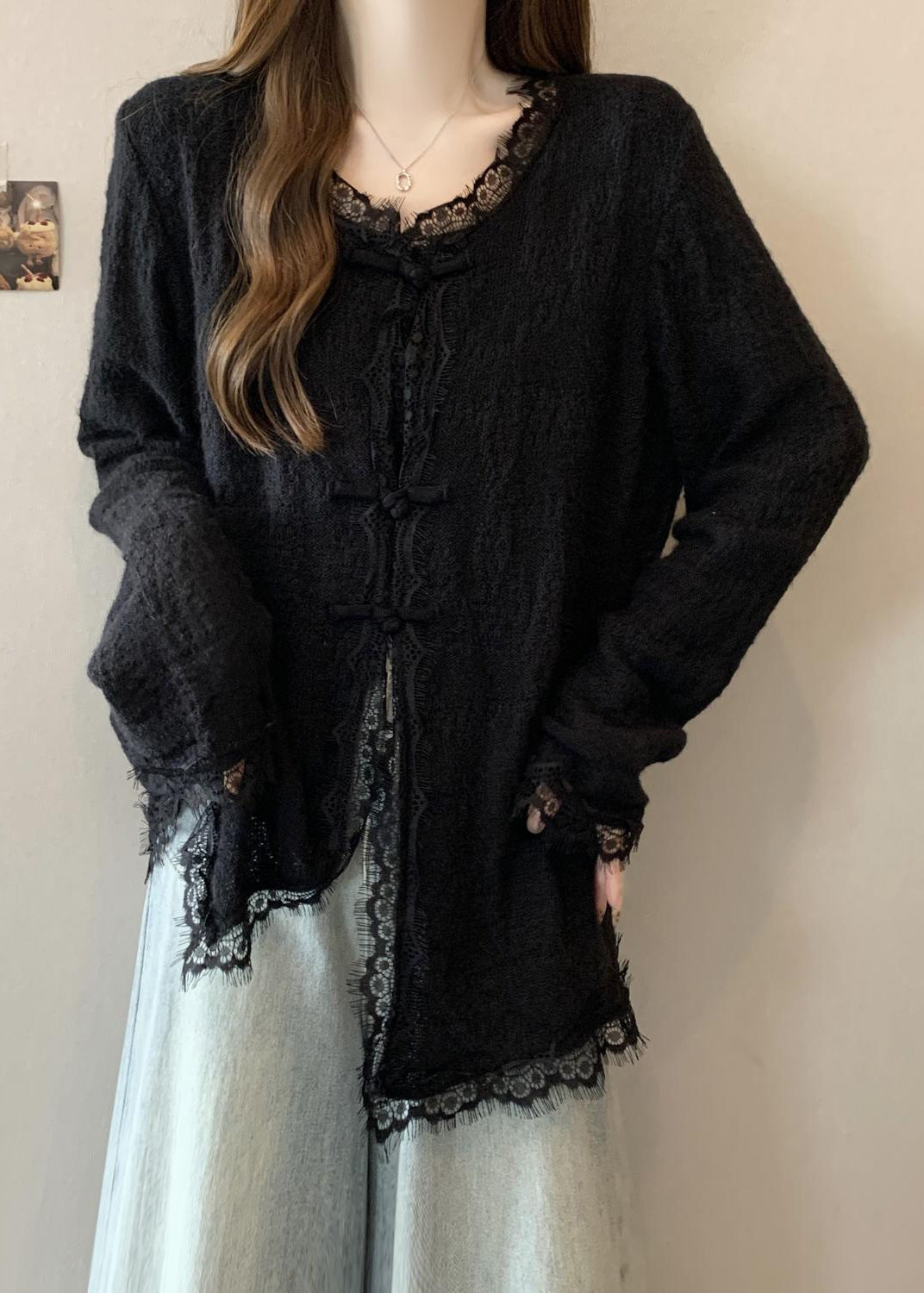 Art Black Oversized Eyelash Patchwork Knit Oriental Cardigan Fall