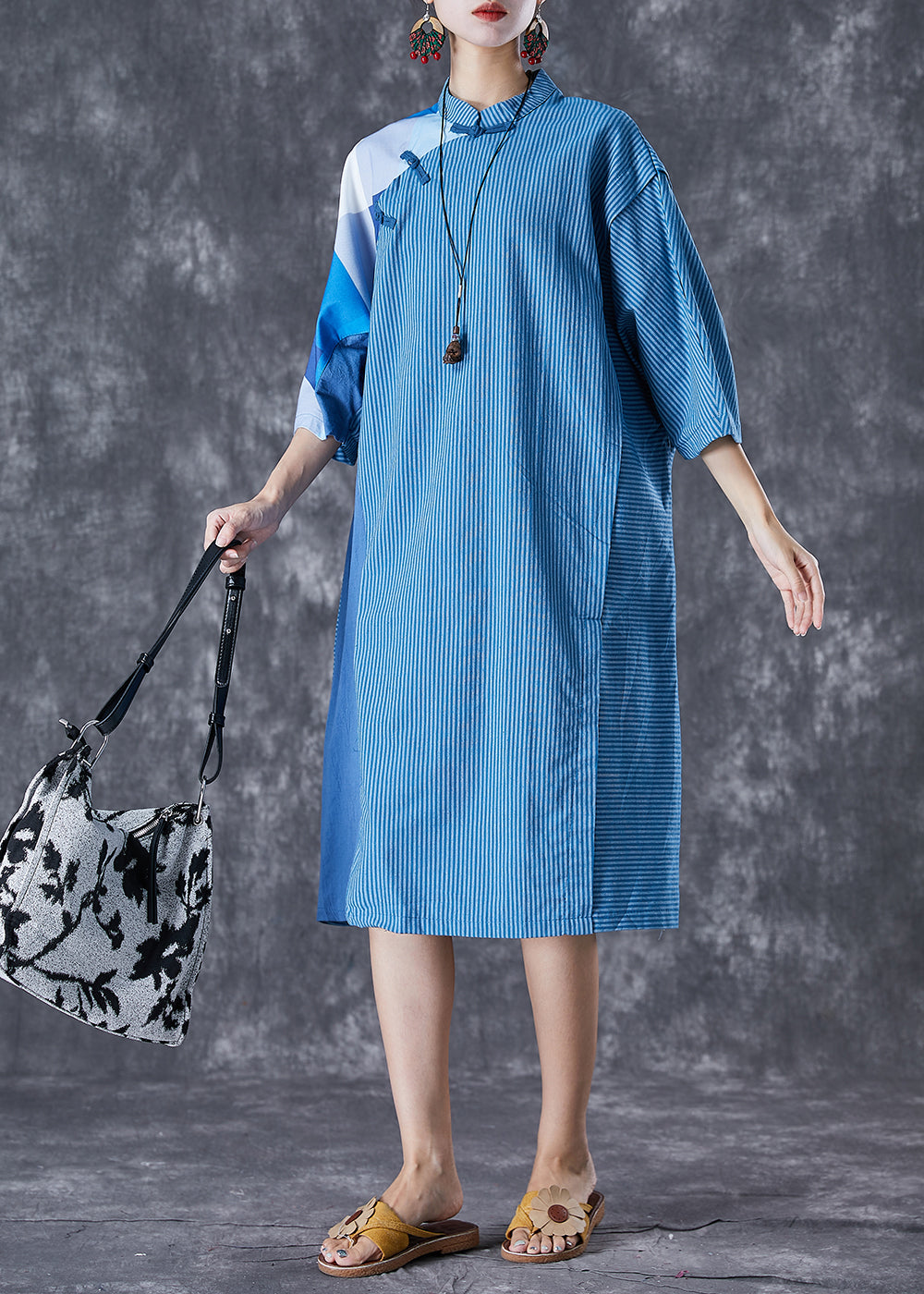 Art Blue Striped Patchwork Chinese Button Linen Dresses Summer