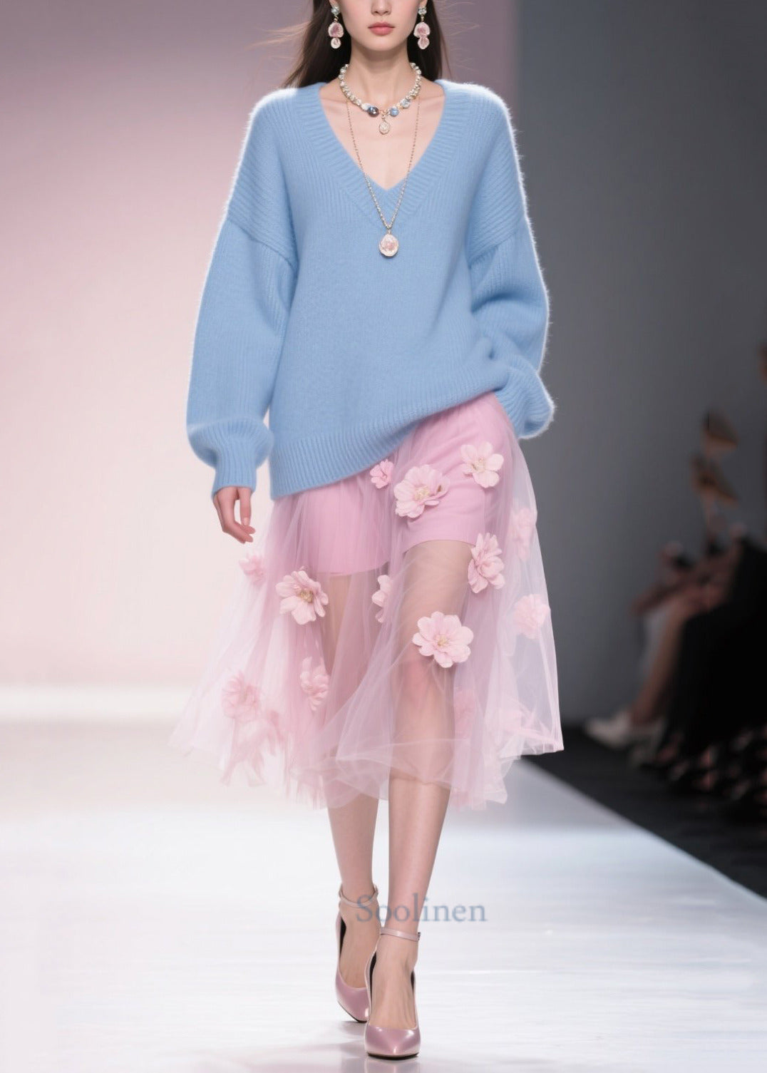 Art Blue V Neck Thick Cozy Sweater Tops Winter