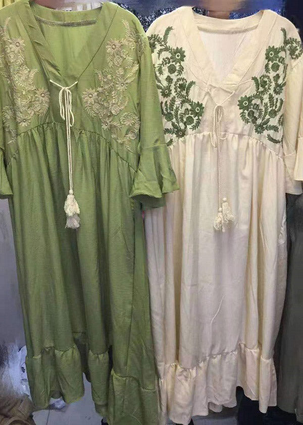 Beautiful Apricot V Neck Embroideried Ruffled Tassel Tie Waist Long Dresses Flare Sleeve