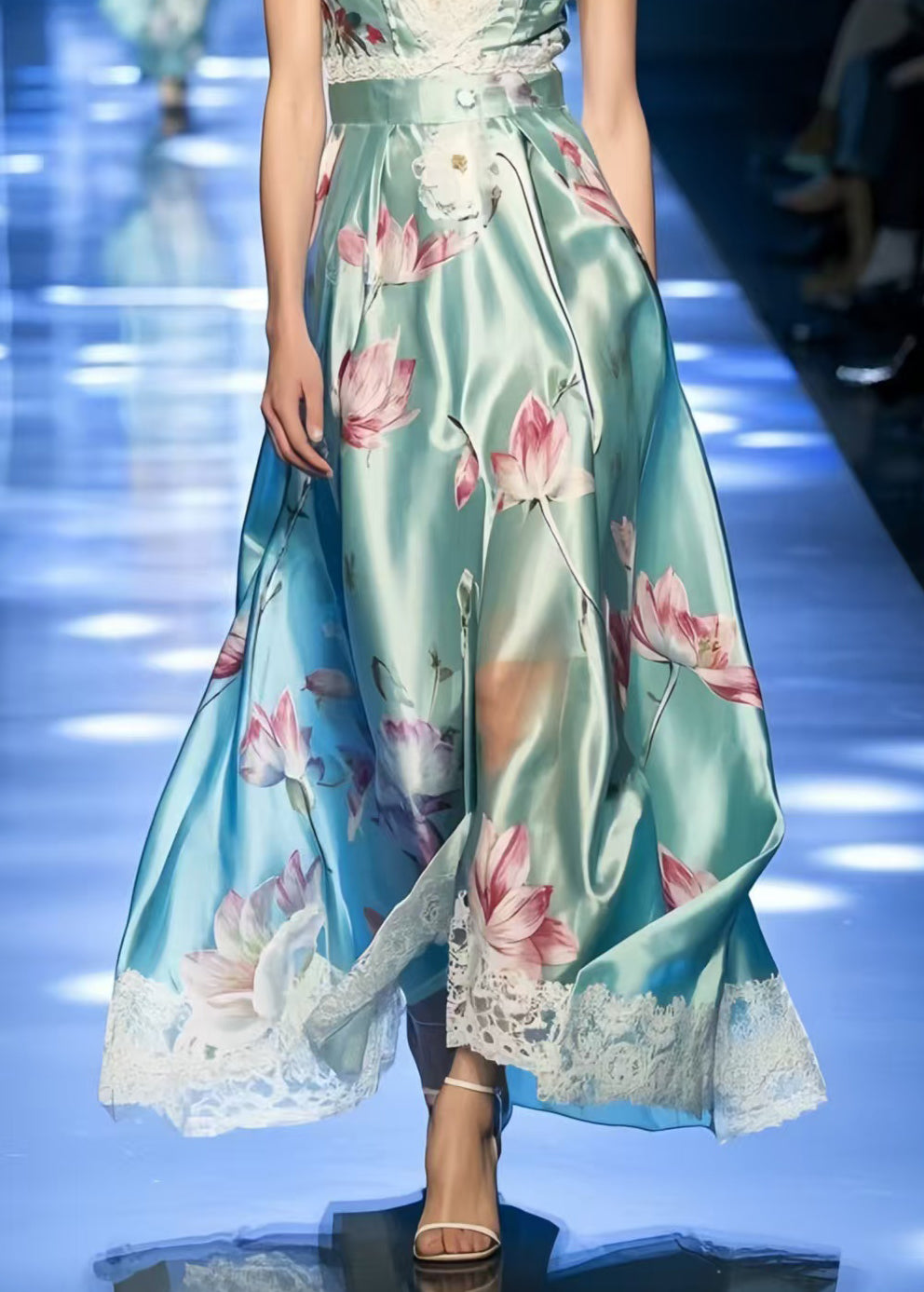 Beautiful Lake Green Print Exra Large Hem Silk Party Sundress