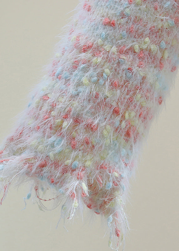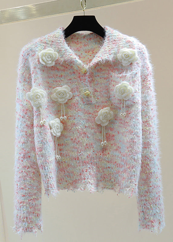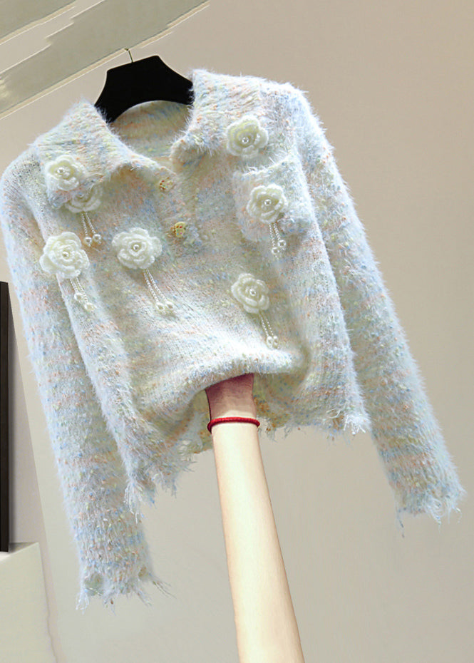 Beautiful Light Blue Peter Pan Collar Floral Tassel Thick Cotton Knitted Sweater Winter