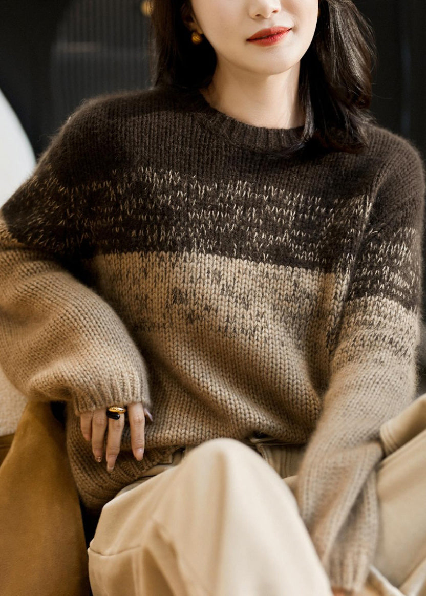 Beautiful Pink Gradient O Neck Thick Woolen Knit Pullover Winter